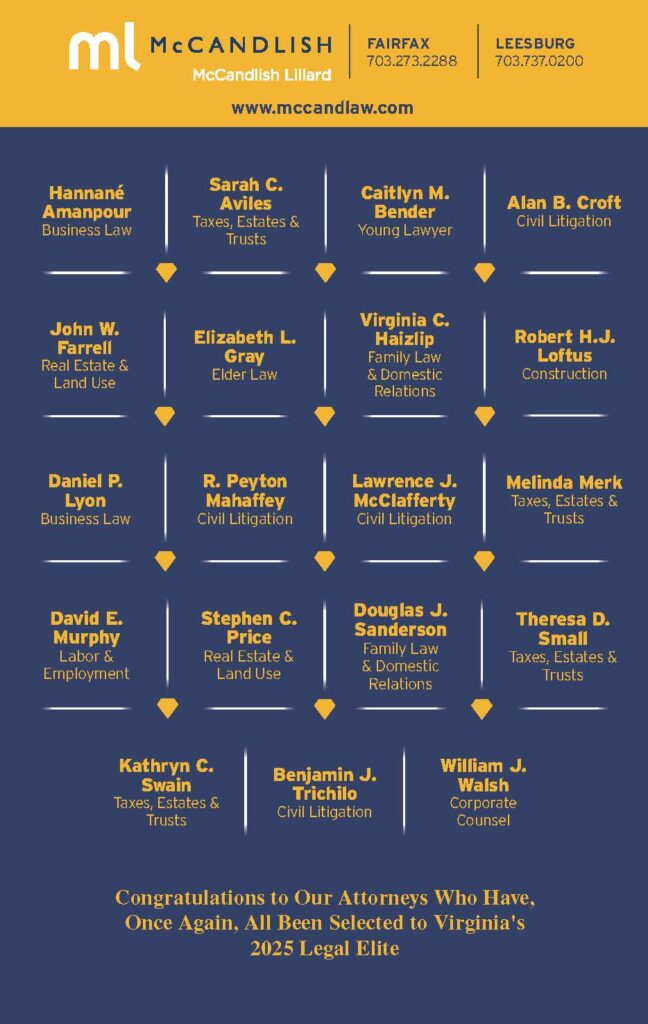 McCandlish Lillard is pleased to announce that once again, all of its eligible attorneys have been recognized by Virginia Business magazine as being among Virginiaโs โLegal Elite.โ Virginia Business magazine and Virginia Lawyers Weekly award the โLegal Eliteโ designation based on the results of a survey offered to more than 14,000 Virginia lawyers. This yearโs list appears in the magazineโs December edition, which was just released.